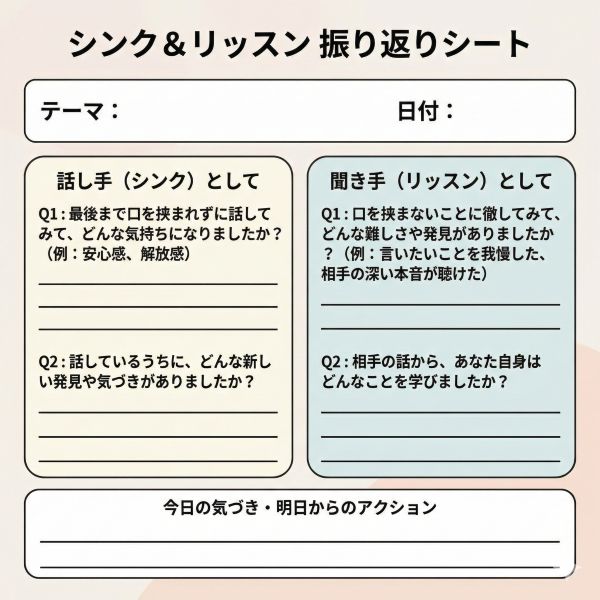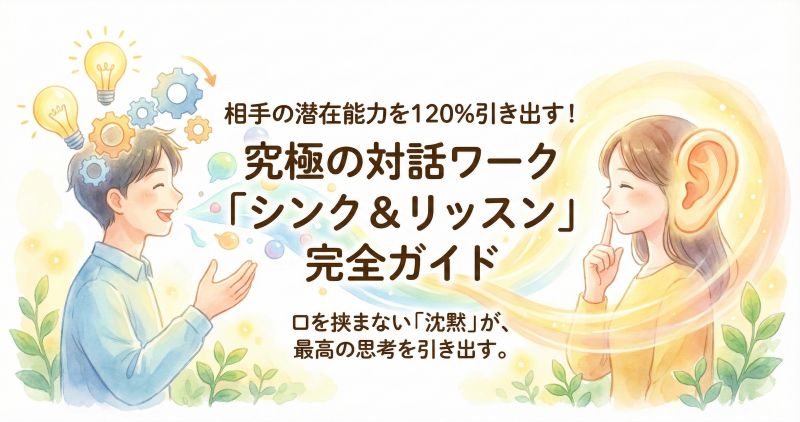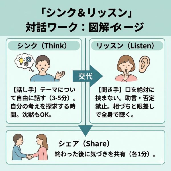 「シンク&リッスン」は、あえて「沈黙」と「口を挟まない時間」を強制的に作ることで、相手の脳内に眠っている答えを掘り起こす「思考のスパ」のようなワークです。
