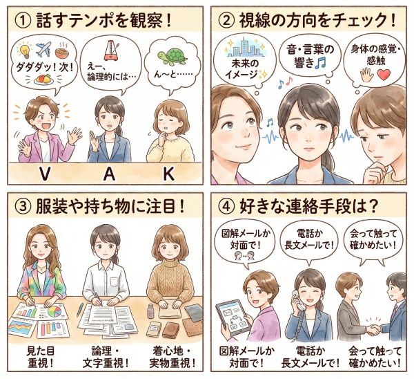 明日から職場で、相手がどのタイプか観察してみましょう。以下のポイントがヒントになります。