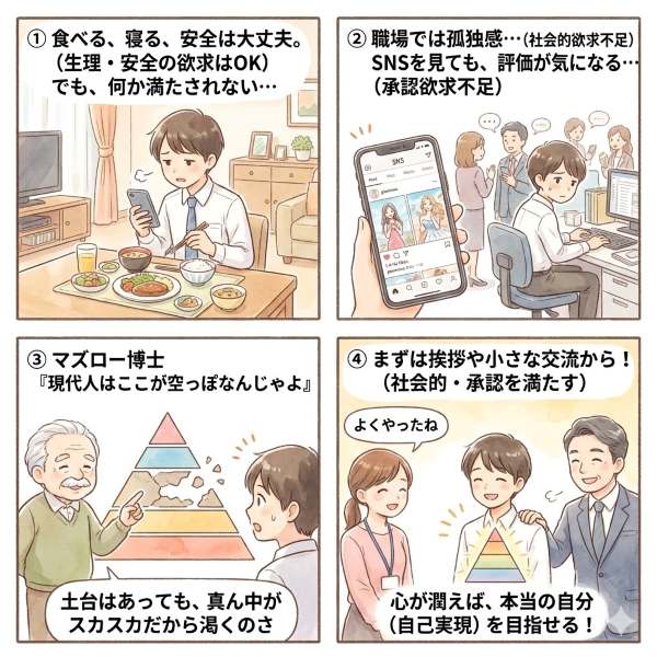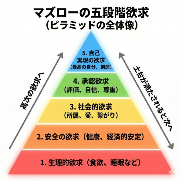 もし、今のあなたが「やりがいが見つからない(自己実現)」と悩んでいるなら、まずは今日、しっかり寝て(生理的)、誰かと温かい会話を交わす(社会的)ことから始めてみてください。土台が安定すれば、心は自然と次のステージへと動き始めます。