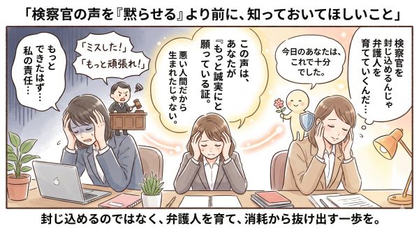 検察官を封じ込めるのではなく、「今日のあなたは、これで十分だった」という弁護人の声を、少しずつ育てていくこと。