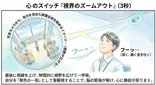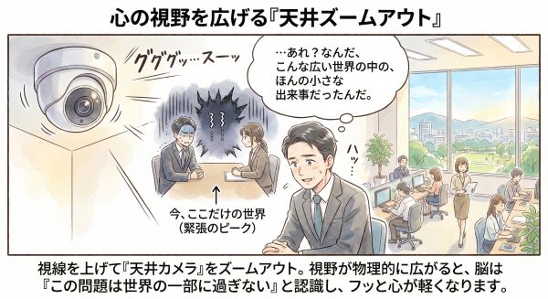 カメラを引き(ズームアウト)にすると、二人の周りにある机や椅子、窓の外の景色までが見えてきます。視野が物理的に広がると、脳は「この問題は世界の一部に過ぎない」と認識し、過度な緊張を解き始めます。