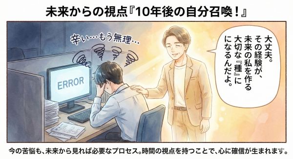 未来の、すべてを乗り越えて穏やかに笑っている自分を想像し、今の自分を後ろから見守ってもらいます。未来の視点から見れば、現在の苦悩は「成長に必要なプロセスの断片」に見えるはずです。この時間軸のメタ認知が、リーダーとしての孤独を「確信」へと変えてくれます。