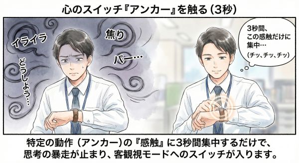 自分の時計のベルトを触る、メガネの位置を直す、あるいは深く椅子に背中を預ける。なんでも構いません。特定の物理的な動作を「自分を客観視するスイッチ」として決めます。その感触に意識を集中させ、思考の暴走を一度止めます。