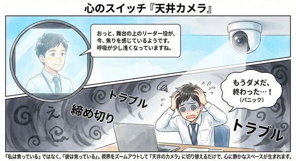 NLPではこれを「ディソシエーション(解離)」と呼びます。今この瞬間、悩んでいる自分を、役者として舞台の上に置いたまま、あなた自身は客席の最後列、あるいは「天井の監視カメラ」の位置まで視点をスライドさせてみるのです。