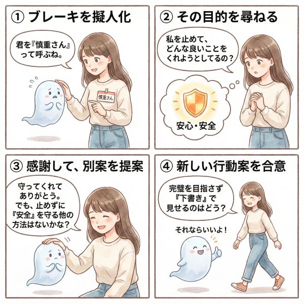 ブレーキを無理やり引きちぎろうとすると、心はさらに強く抵抗します。大切なのは、ブレーキが持っている「守りの目的」を理解し、味方に変えることです。