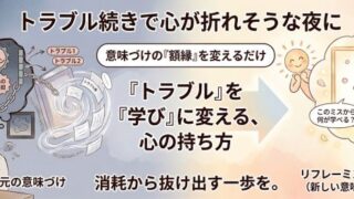 マインドセット トラブル続きで心が折れそうな夜に—逆境を「成長のデータ」に書き換えるNLPリフレーミングの話 トラブルが続いて心が折れそうな夜、「前向きに考えよう」という言葉が空回りするのはなぜでしょうか。NLPのリフレーミングは、ポジティブ変換ではなく「出来事の意味と文脈を変える」技術です。逆境を成長のデータに書き換えるための視点を、静かに整理します。 2026.03.07 マインドセット