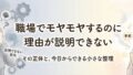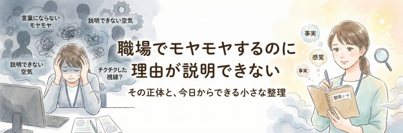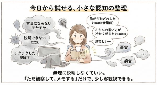 会議中なのか、特定の人と話すときなのか、業務の内容そのものなのか。場面を一つでも特定できると、モヤモヤの輪郭が少しだけ見えてくる。
