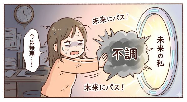 「今は仕方ない、もう少し頑張れば変わる」という考え方で、不調を先送りにするパターンです。